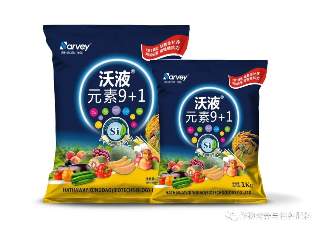 沃液元素9+1含有所有的中微量元素,具体含量为氧化钙≥17.9%、氧化镁≥4.5%、铜≥0.05%、锌≥0.05%、硼≥0.05%、锰≥0.05%、铁≥0.05%、钼≥0.005%、硫≥0.005%、硅≥0.005%,可补充果树生长所需的所有中微量元素,高效补充钙元素,特别添加硅元素,提高作物抵抗力,并可调控释放土壤中固定的养分,满足果树对各种养分的需求,有效促进果树来年的花芽分化。